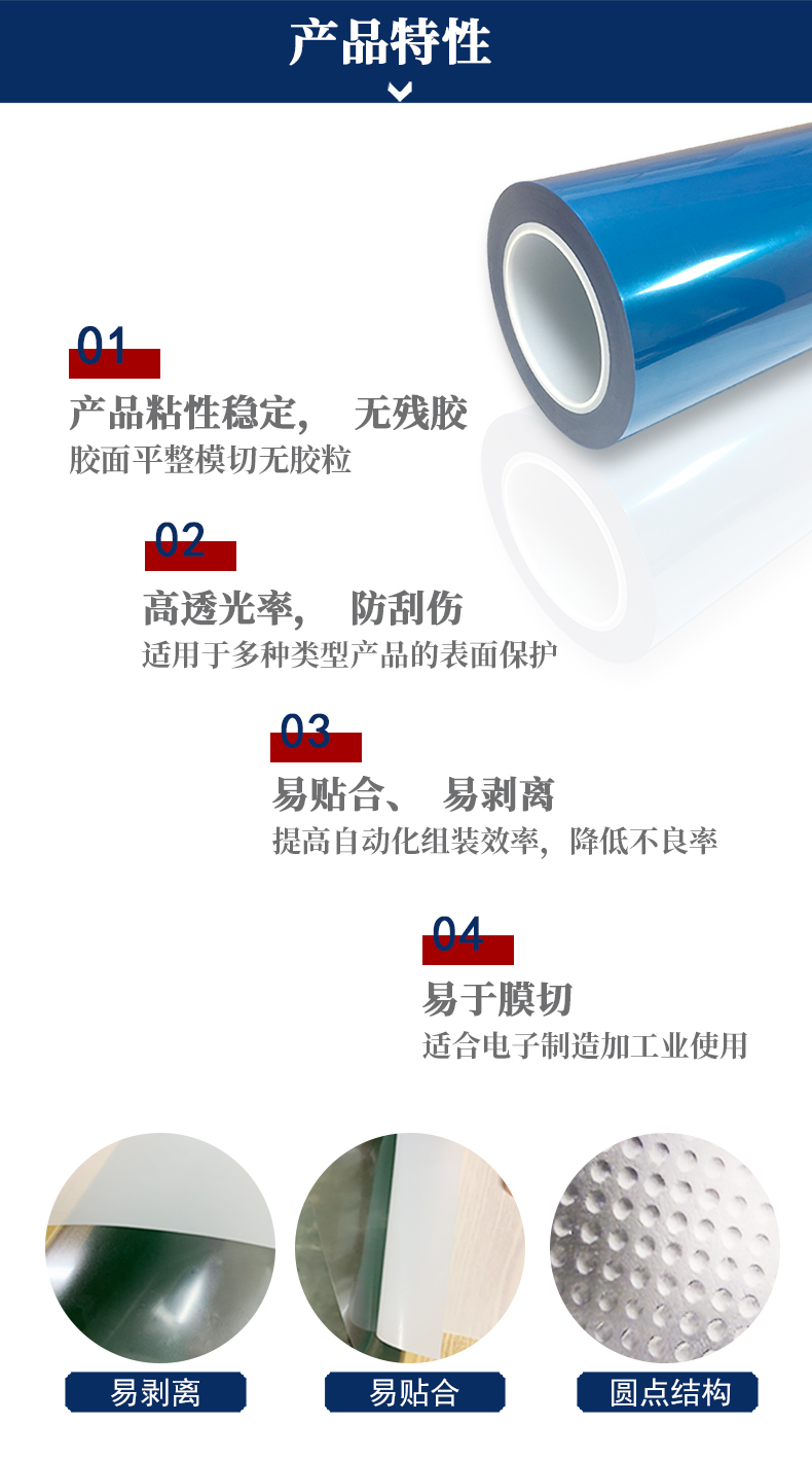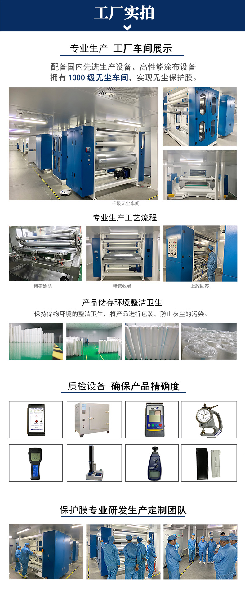 备注:我司专注中高端保护膜开发及应用,产品具有洁净度高、粘性稳定、耐候性佳等特点,广泛应用于各个领域。具体数据由我们公司业务和技术部门提供。同时可为您提供专业的保护膜解决方案。